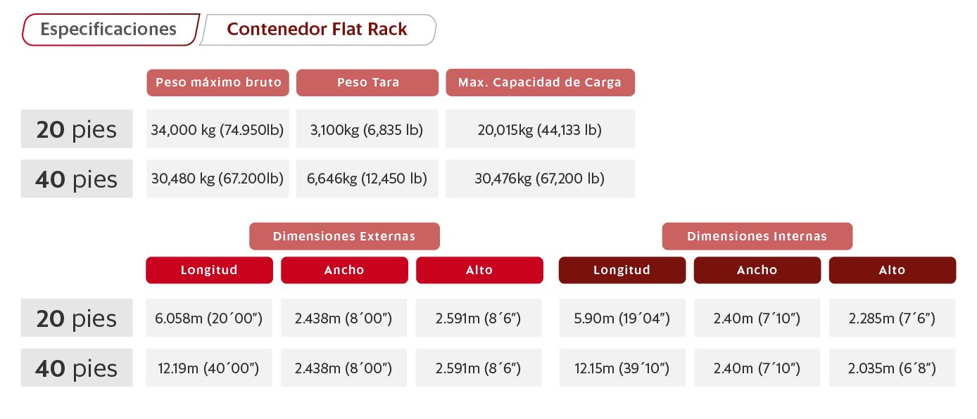Los Flat Rack no tienen techo y carecen de paredes laterales (o son desmontables). Algunos modelos incluso no llevan paredes frontales ni posteriores. Normalmente incluyen piso de madera.