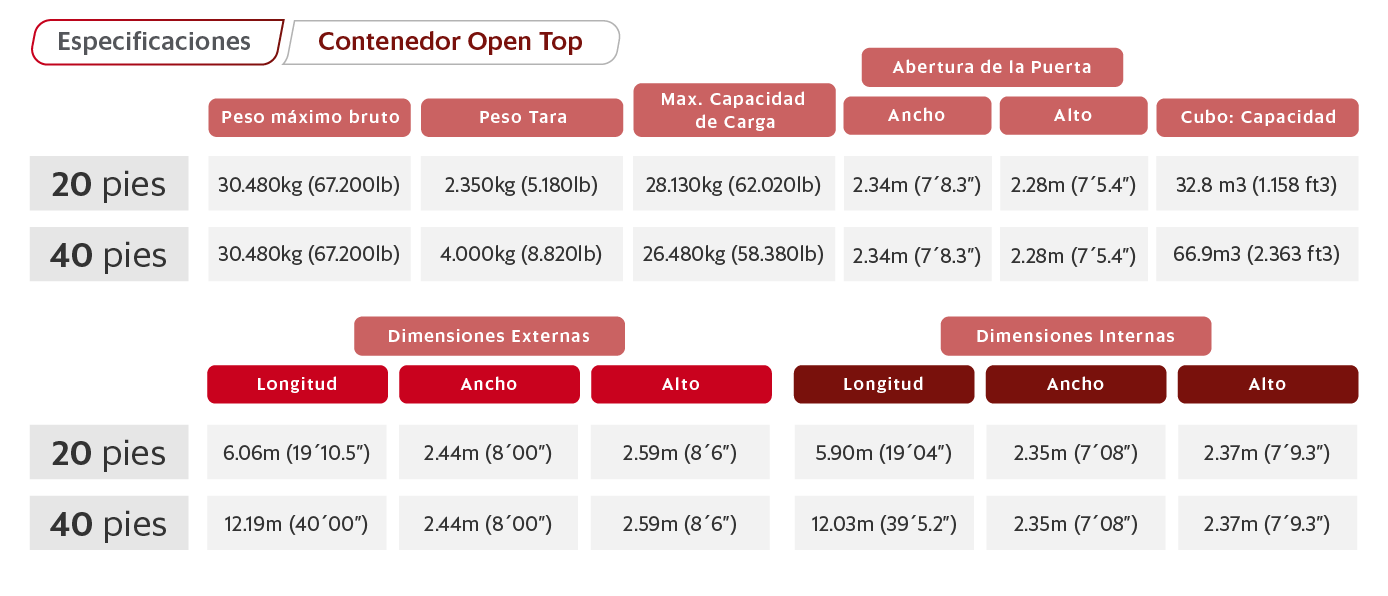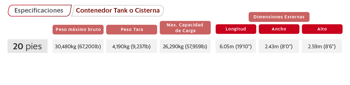 • 20 pies (aprox. 6 m de largo), con peso bruto máximo cercano a 30.48 toneladas (contenedor + carga).