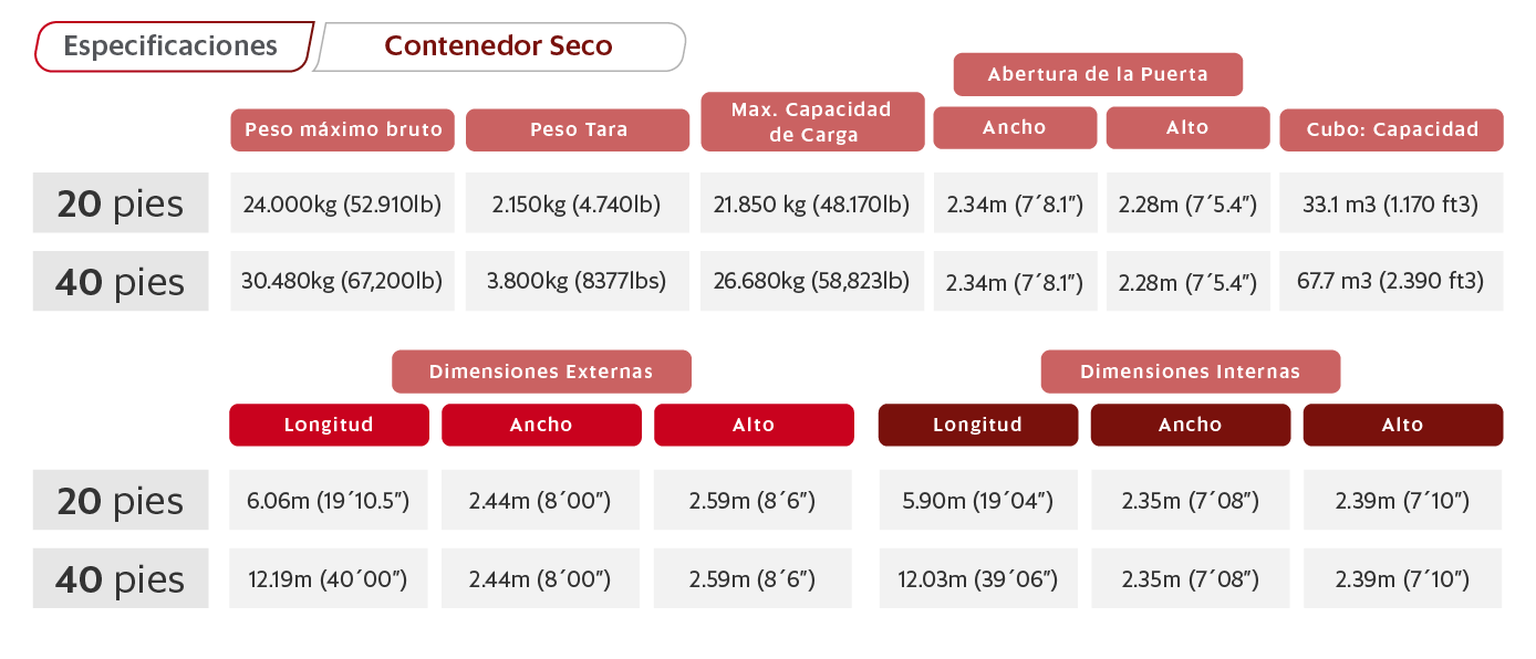 Sus medidas suelen corresponder a las del estándar: 20 o 40 pies, bajo lineamientos de estandarización ISO.